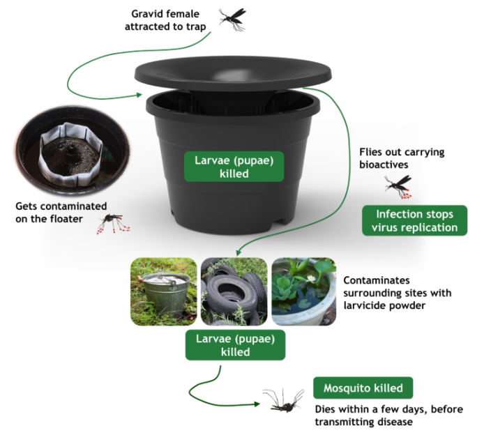 Traps are used alongside larvicide solutions to curb the count of adult mosquitoes as well as their larvae.